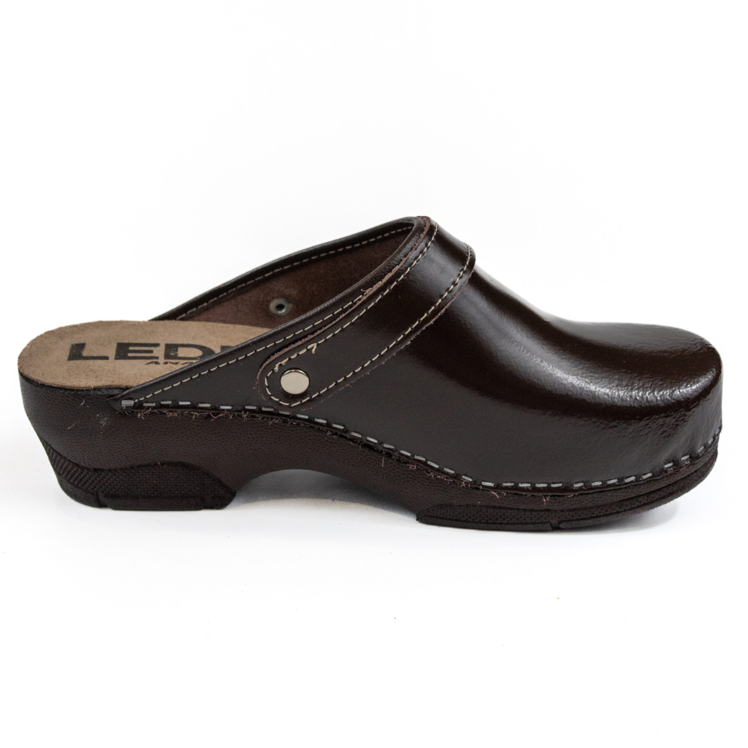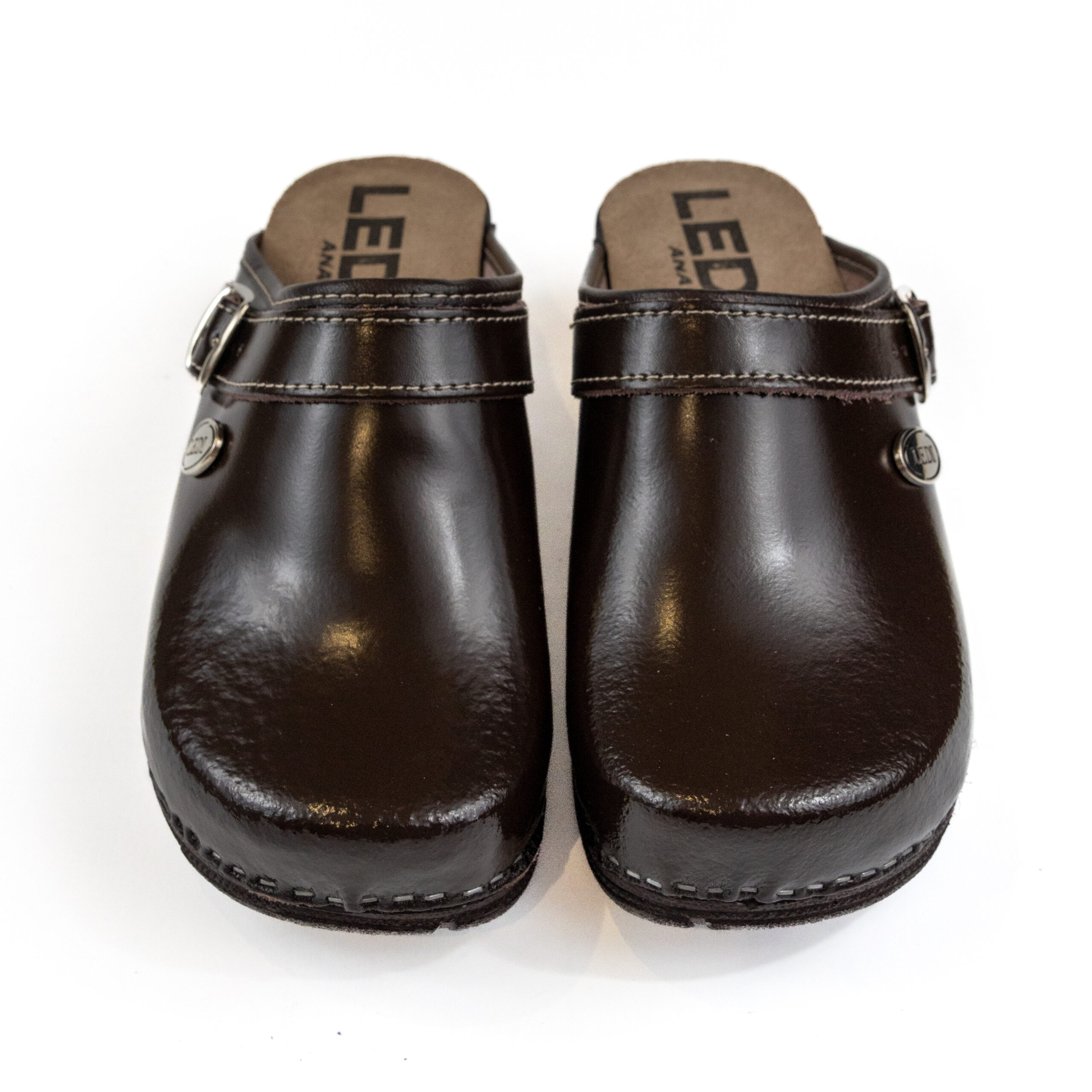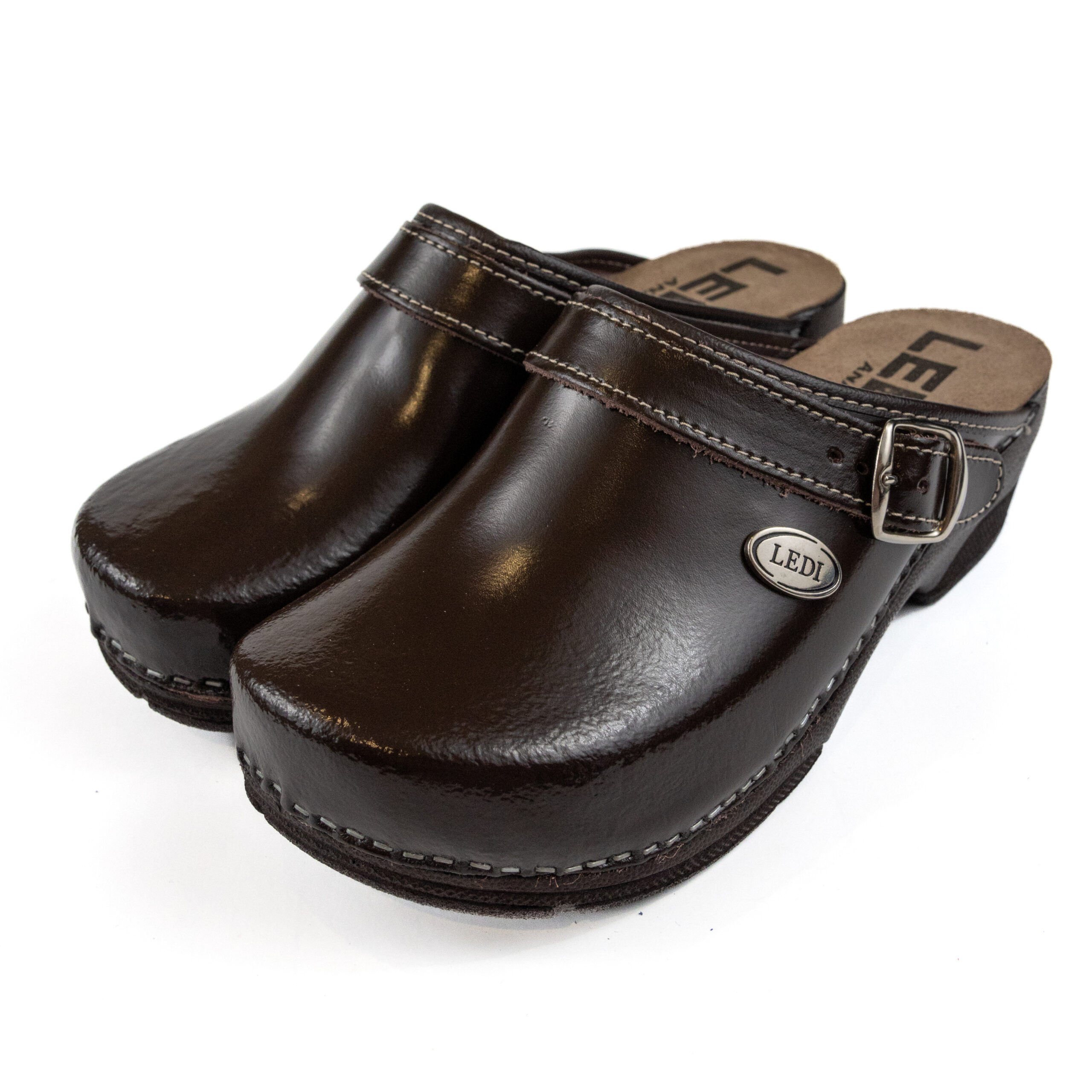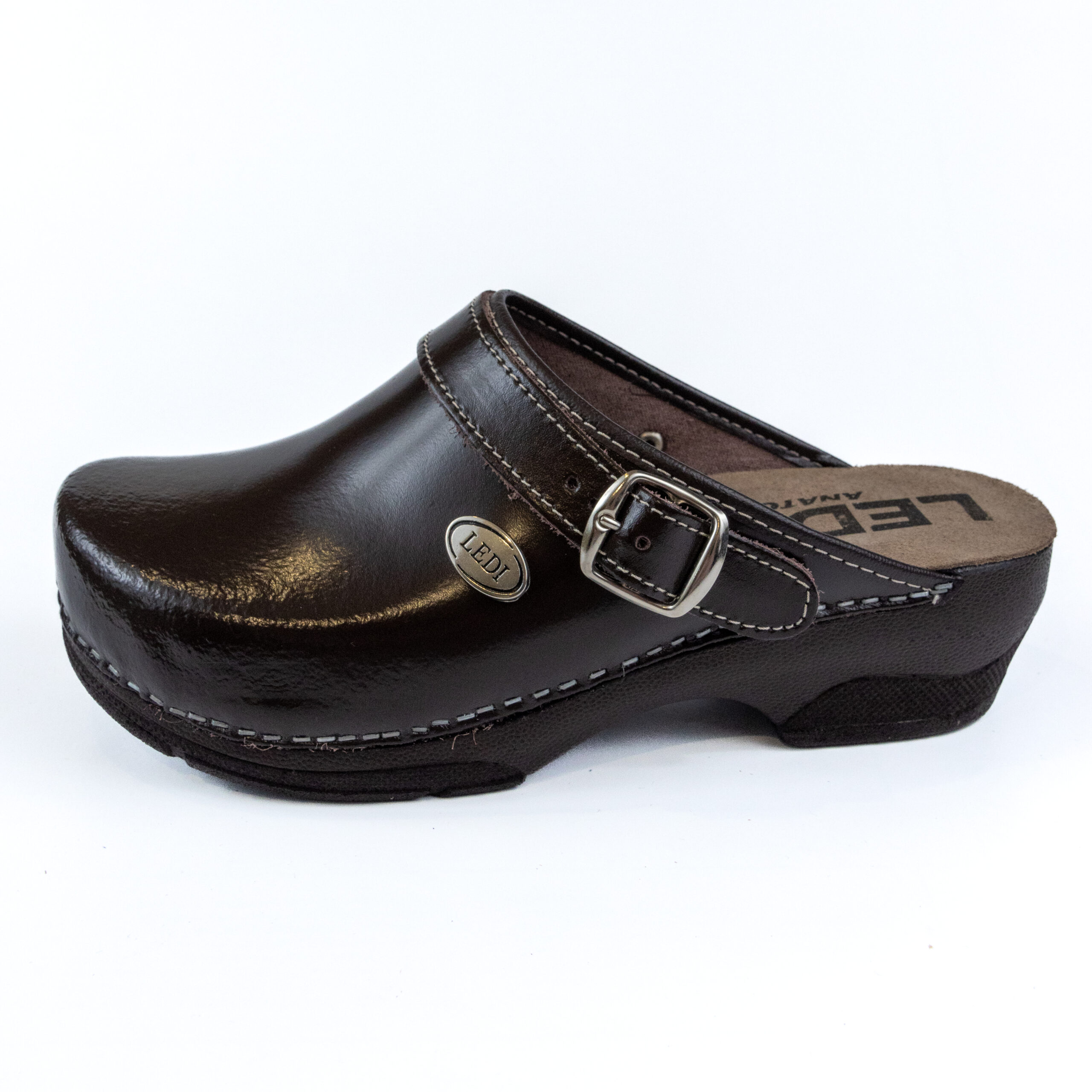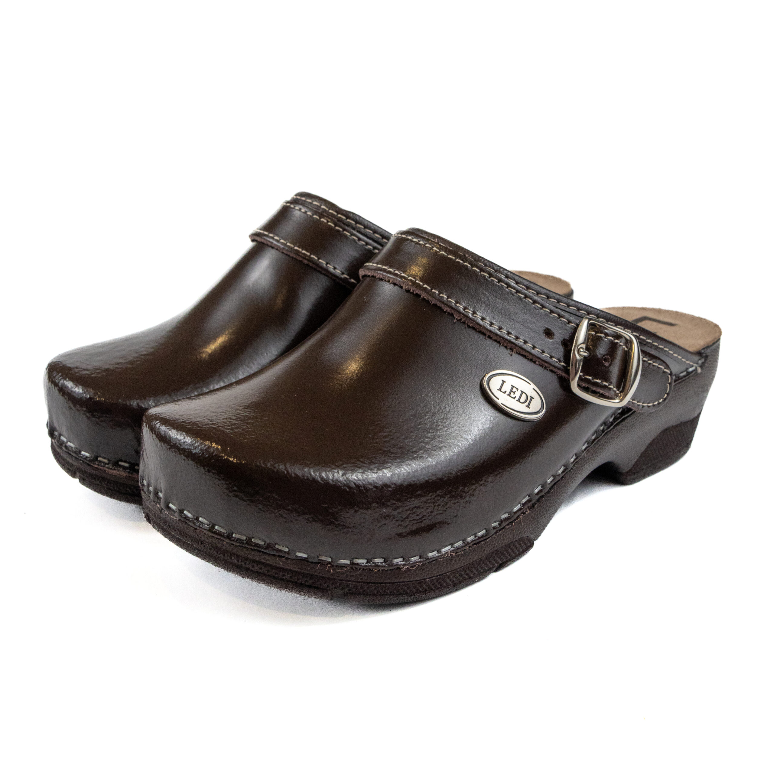 Дамско ортопедично сабо, естествена кожа, кафяв цвят, на твърд табан, принуждаващ стъпалото да заеме определената от ходилото извивка, на олекотено полиуретаново ходило с височина 5см.