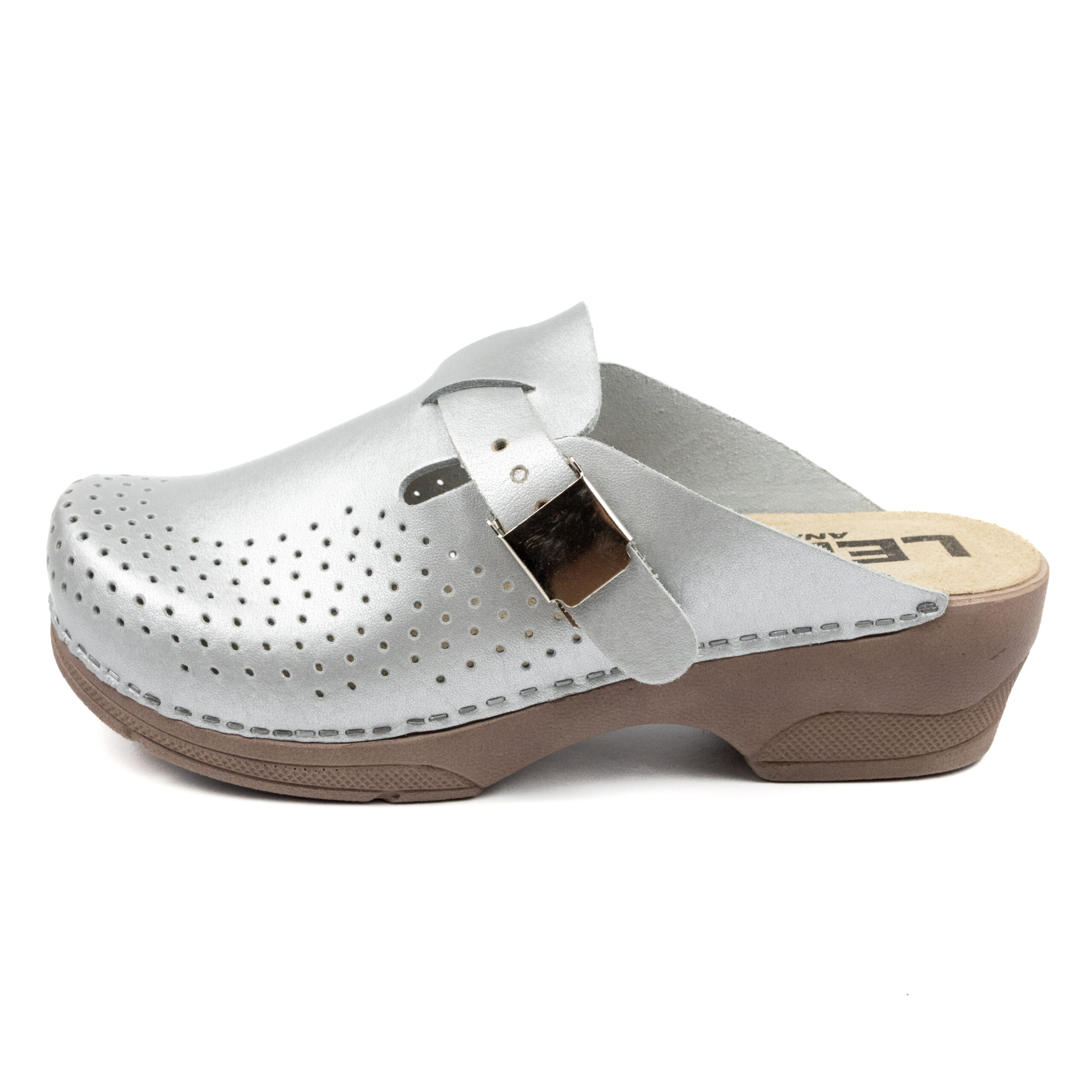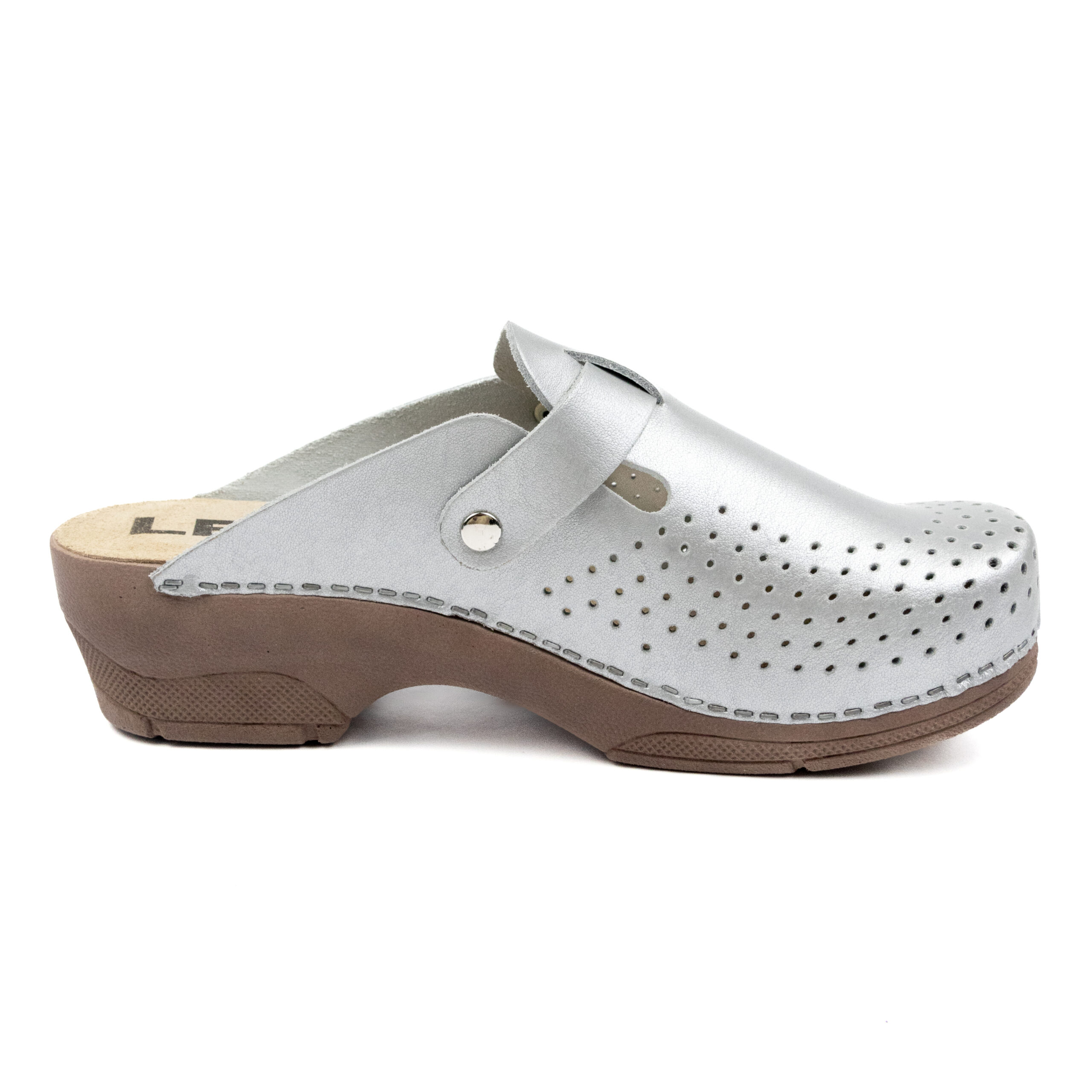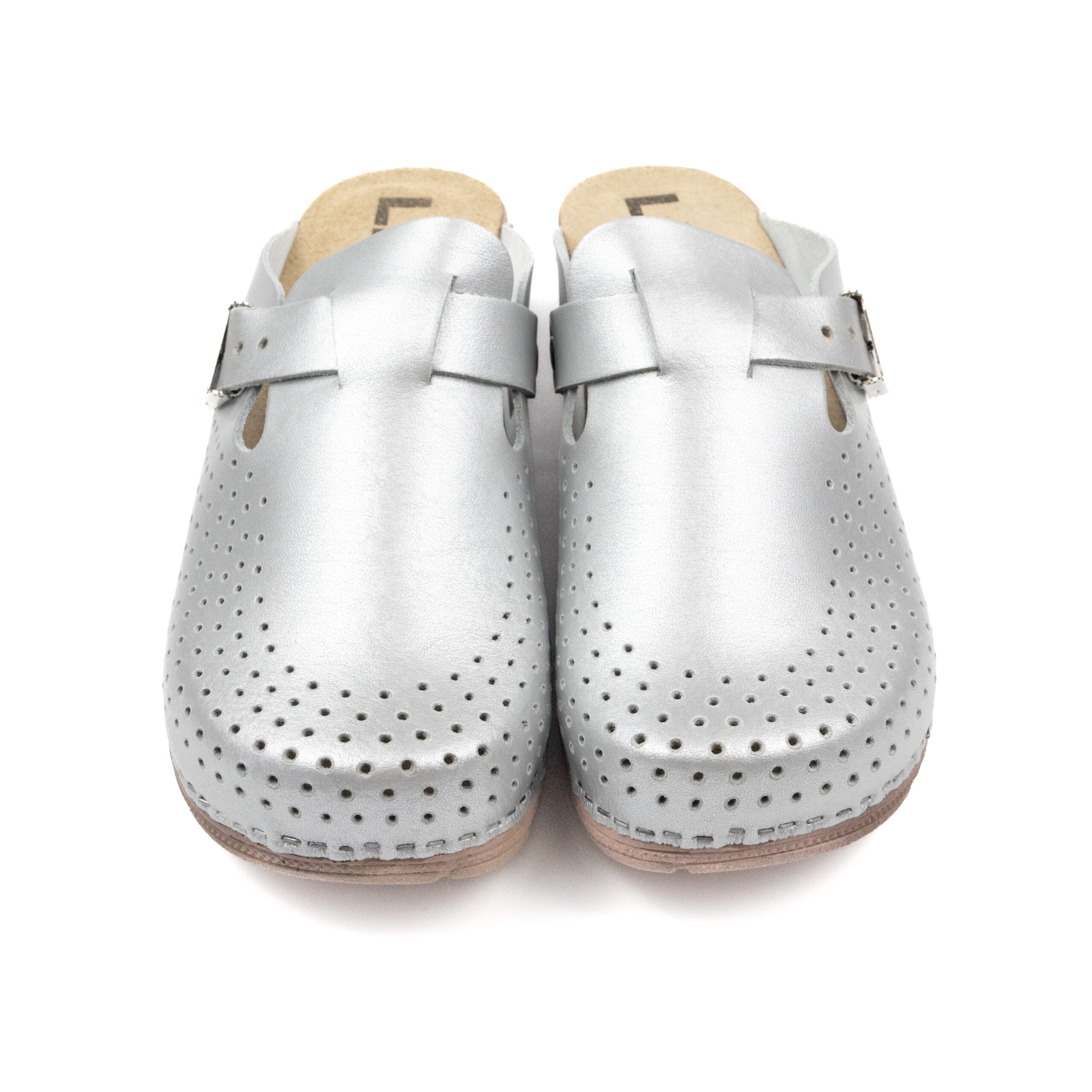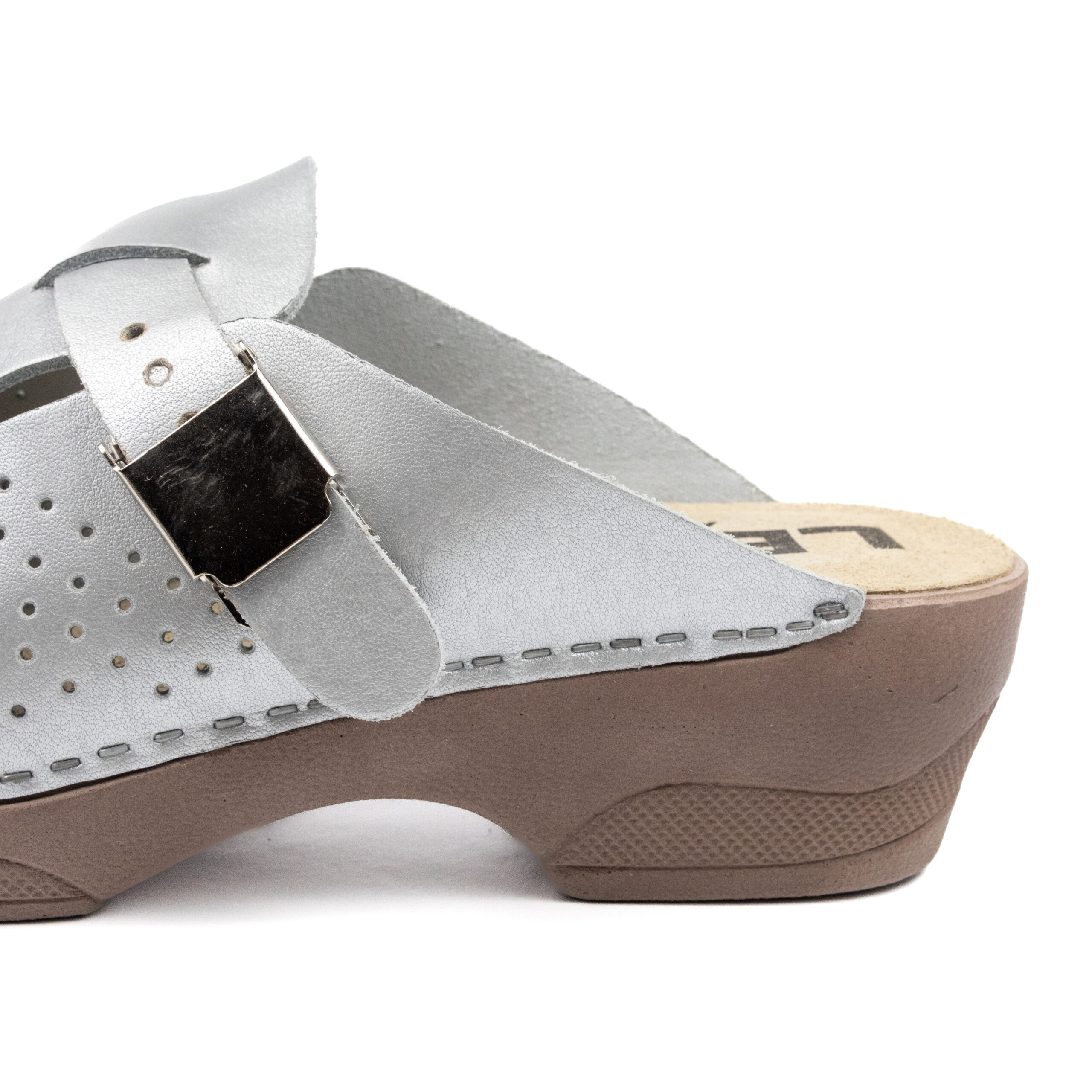 Дамско ортопедично сабо, естествена кожа, сребрист цвят , на твърд табан, принуждаващ надлъжния свод на стъпалото да заема определената от ходилото извивка, на олекотено полиуретаново ходило с височина 4.5 см.