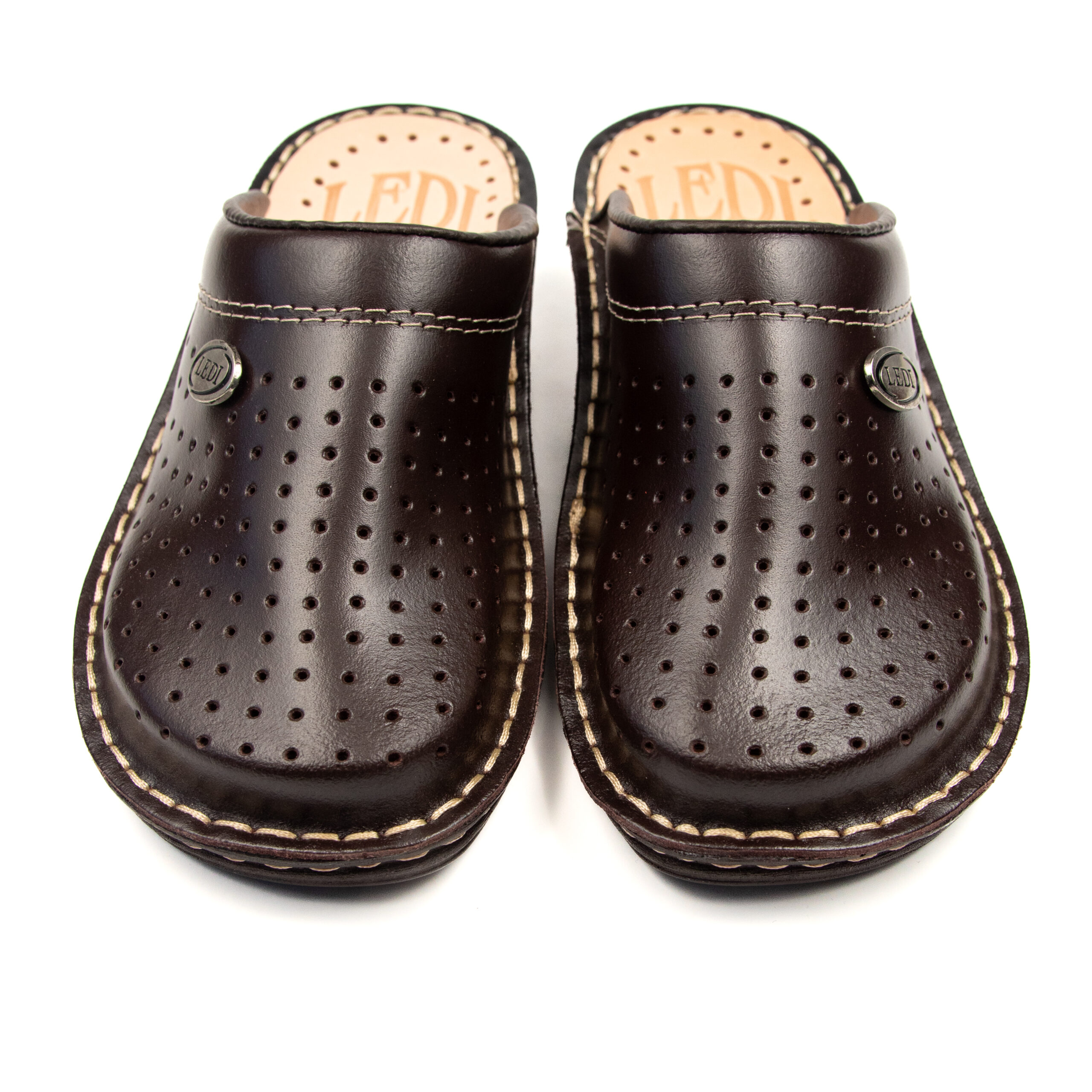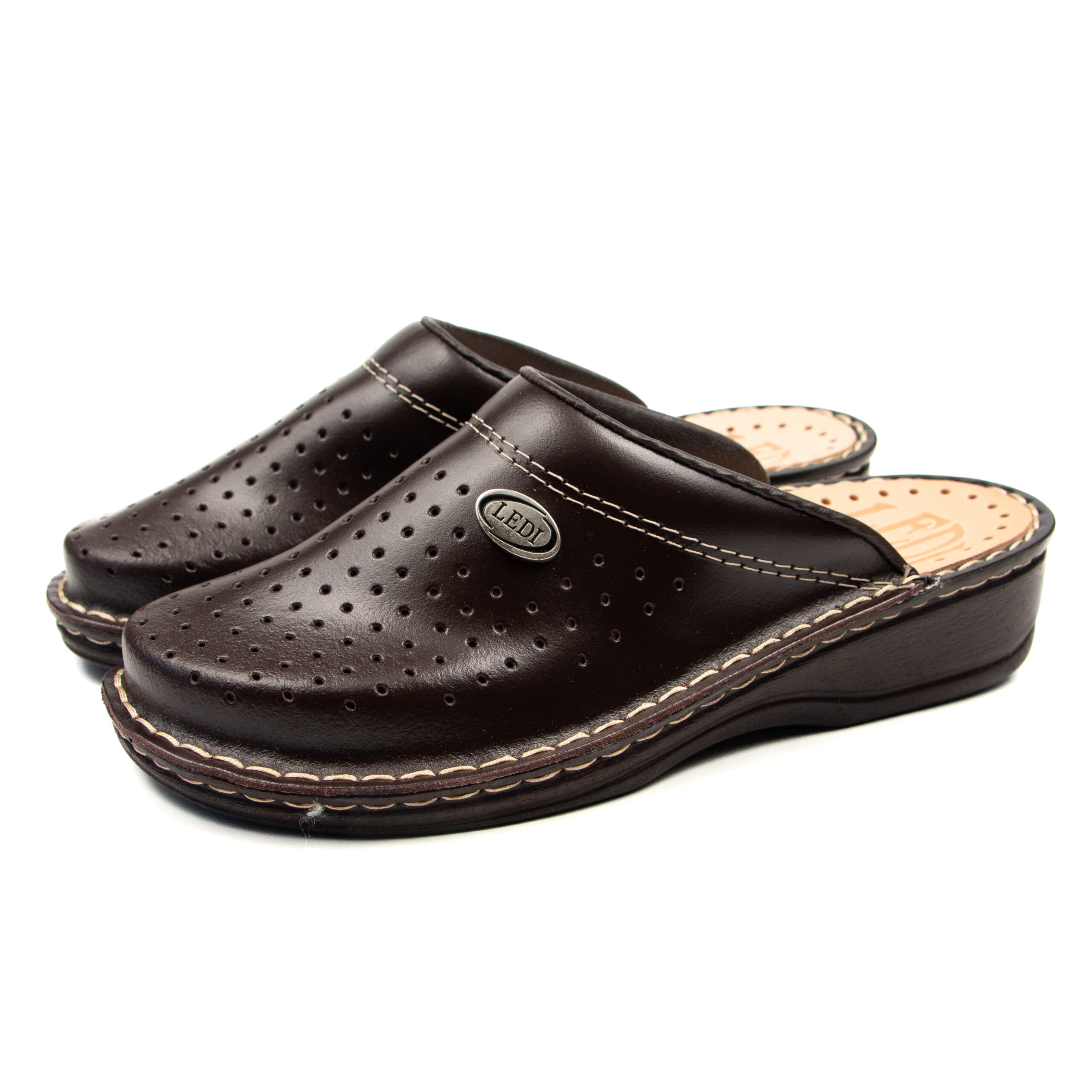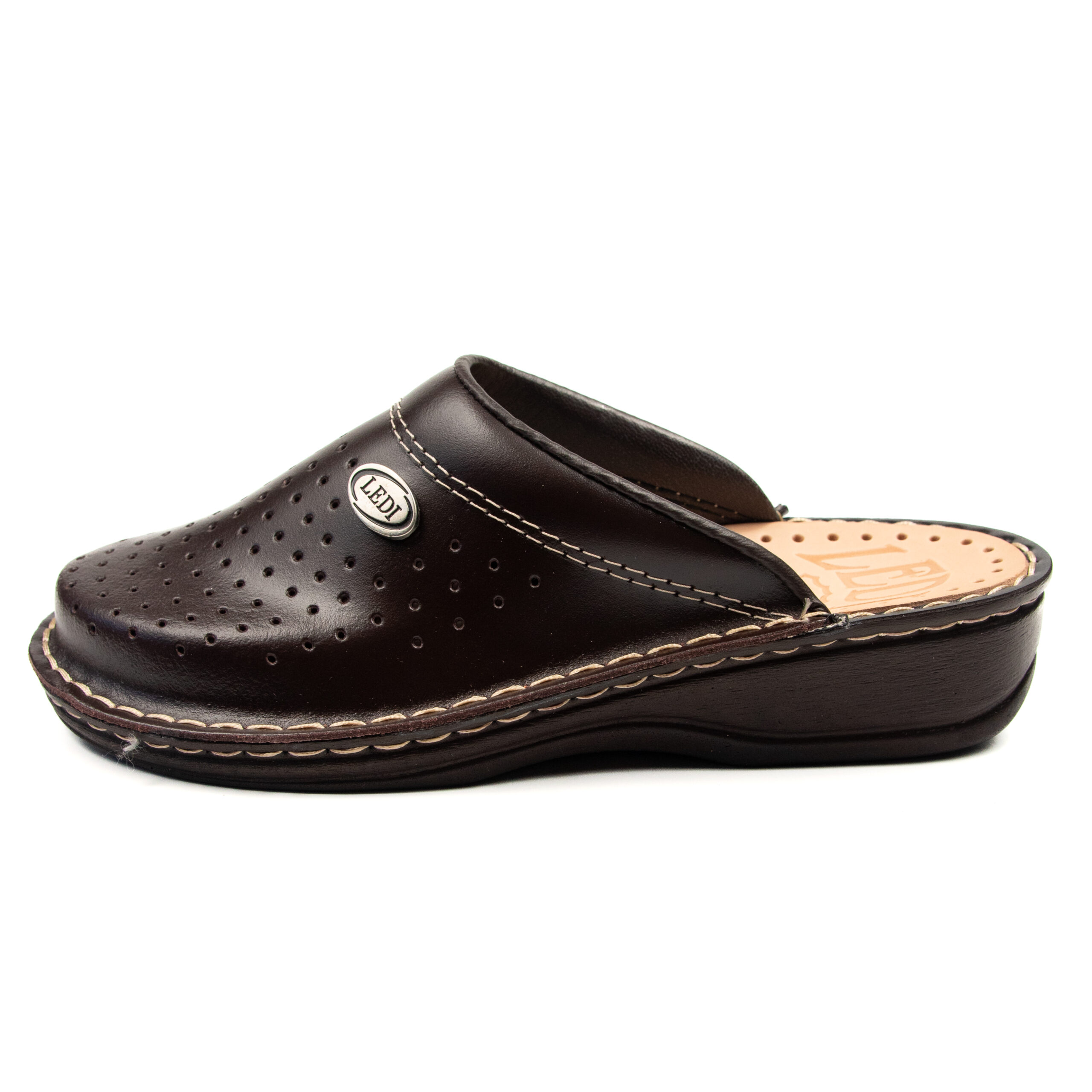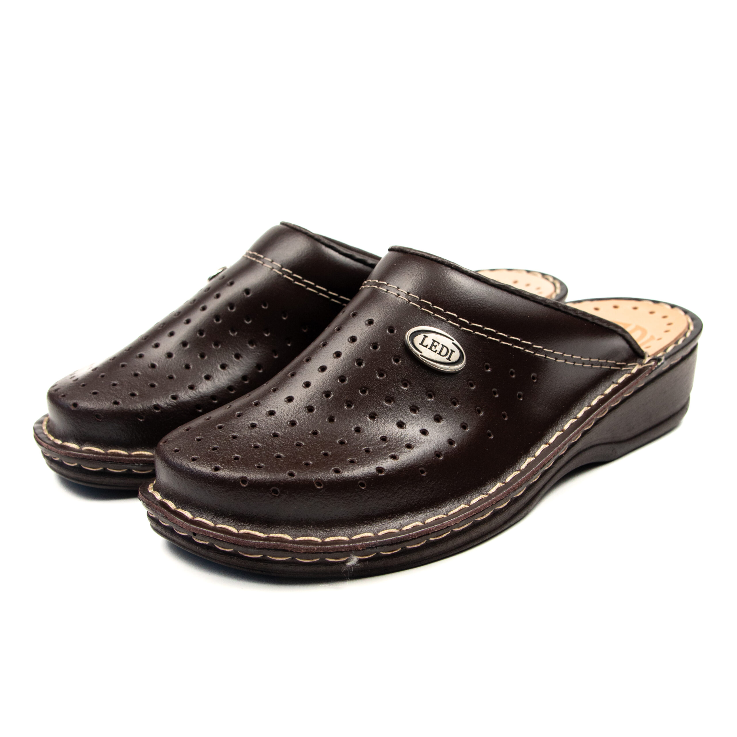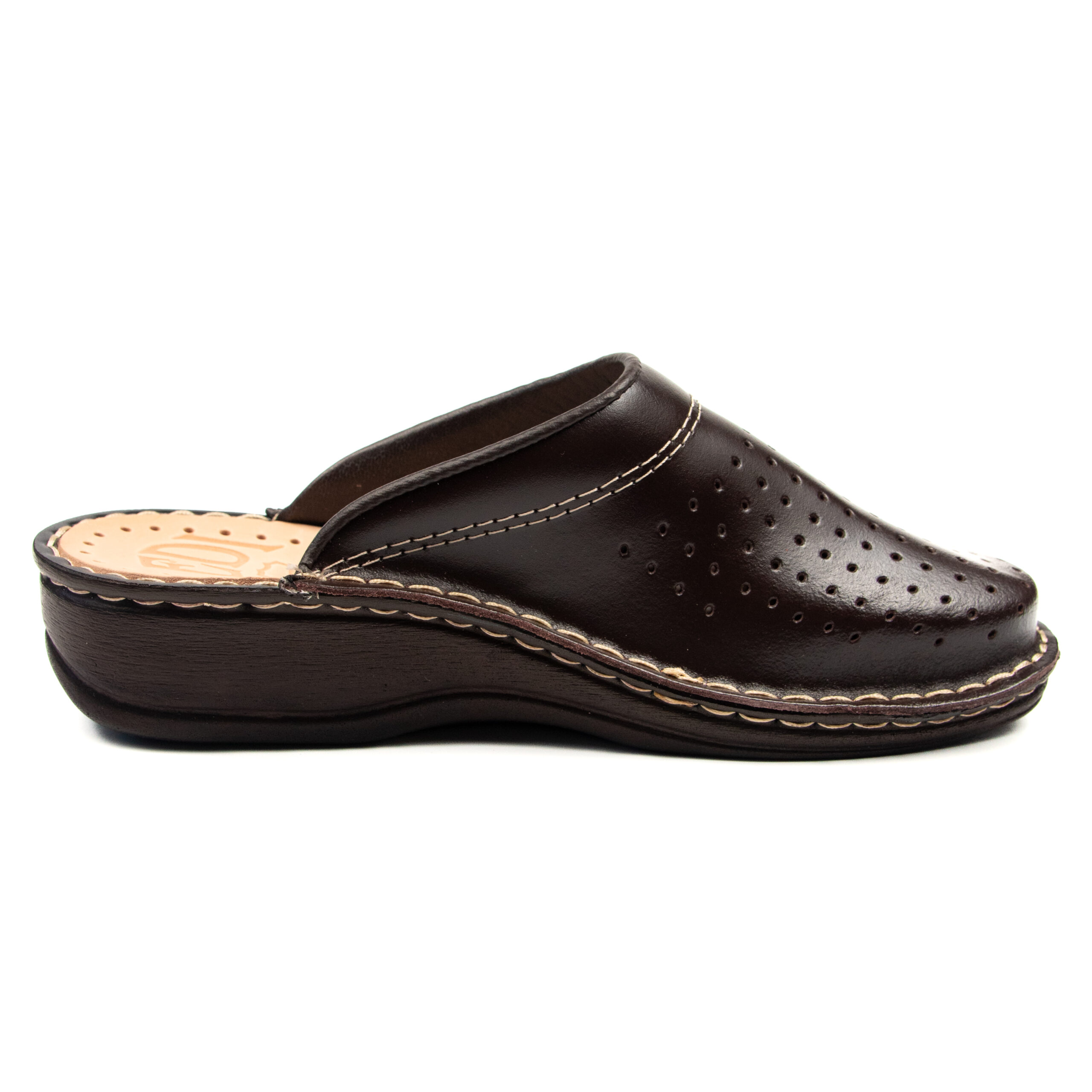 Дамско ортопедично сабо, перфорирана естествена кожа, кафяв цвят, на твърд табан, принуждаващ стъпалото да заеме определената от ходилото извивка, на олекотено полиуретаново ходило с височина 3см.